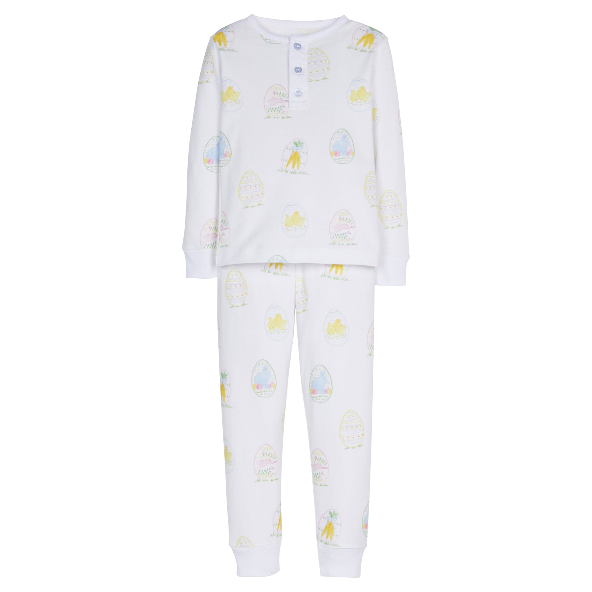 Eggs-cellent news, new jammies have arrived! Made from our softest white pima cotton, this print features a mix of adorable Easter eggs in blues, pinks, yellows, and greens, perfect for Easter Weekend! Sister can also join in on the fun with our matching Ruffled Printed Jammies - Easter Eggs.