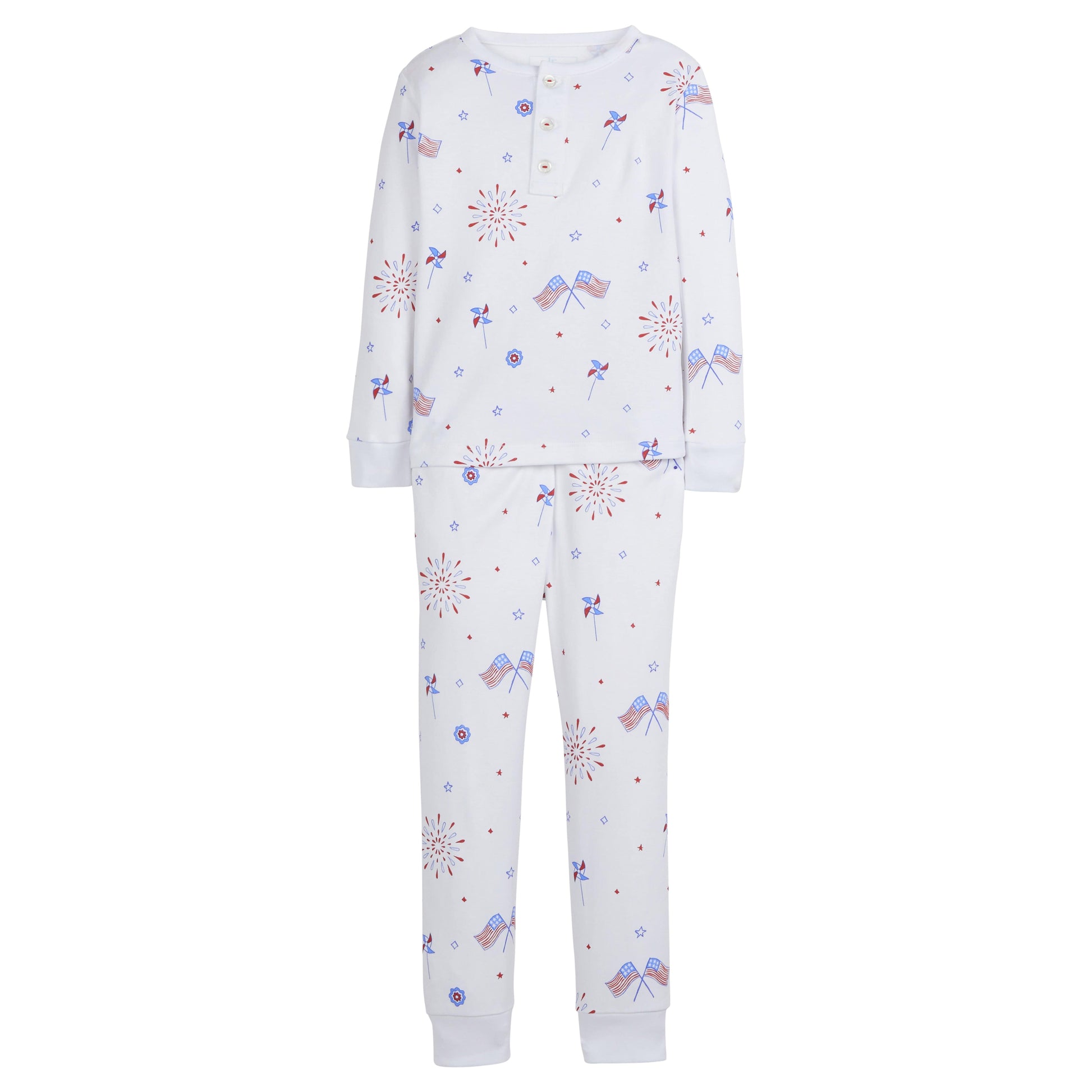 Show some star spangled spirit in our new 4th of July jammies! Made from our softest white pima cotton, this print features an adorable flag and fireworks print in soft reds and blues, just right for Summer! Your little boy will love this design, and baby sibling can coordinate in our matching Printed Playsuit - Patriotic Flags.