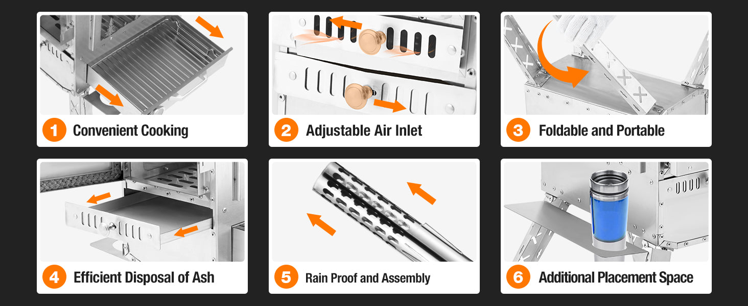 - 🔥【Adjustable damper and ash tray】Wood burning camp stove is designed with an adjustable air inlet to adapt to different situations. Burn slowly to keep tent warm, or burn quickly for cooking. An ash tray under the combustion chamber separates and collects ash. It is beneficial to the combustion of the combustion chamber and more convenient to deal with the ash.