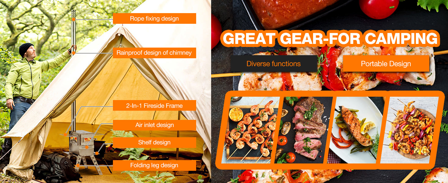 - 🔥【Additional Side Panels】In addition to the wood stove's extension rack, the lower side panels can also provide additional storage space. At the same time, the buckle at the top of the side panel can fix 4 folding legs to avoid accidents.