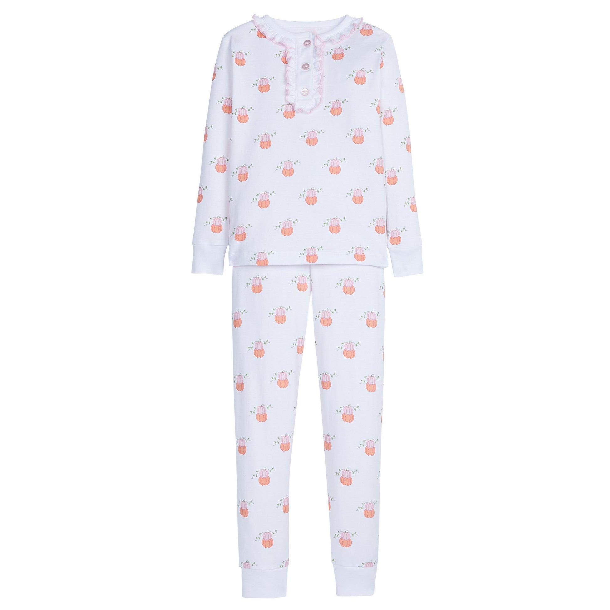 Snuggle up this fall in our Printed Jammies - Pumpkin Stacks. This two piece jammie set features a mini ruffled at the collar with three button closures at the chest and a pink and orange pumpkin stack print throughout. Baby sister can coordinate in our matching Printed Playsuit - Pumpkin Stacks.