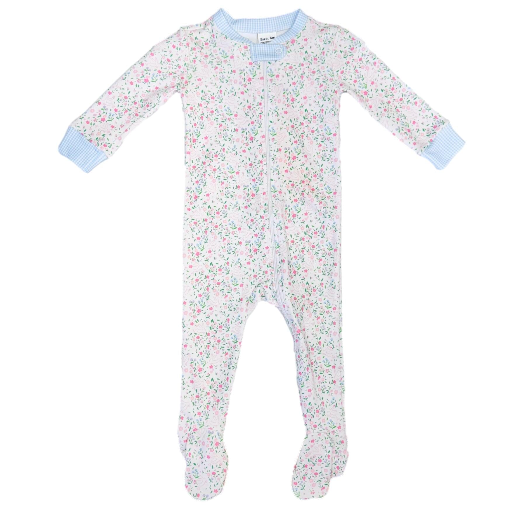 She is sure to have sweet dreams in these cozy Once Upon A Time Footie pajamas in our new custom print! These perfect pajamas feature our custom bunny floral with blue mini gingham welting and cuffs and make for the perfect bedtime story.