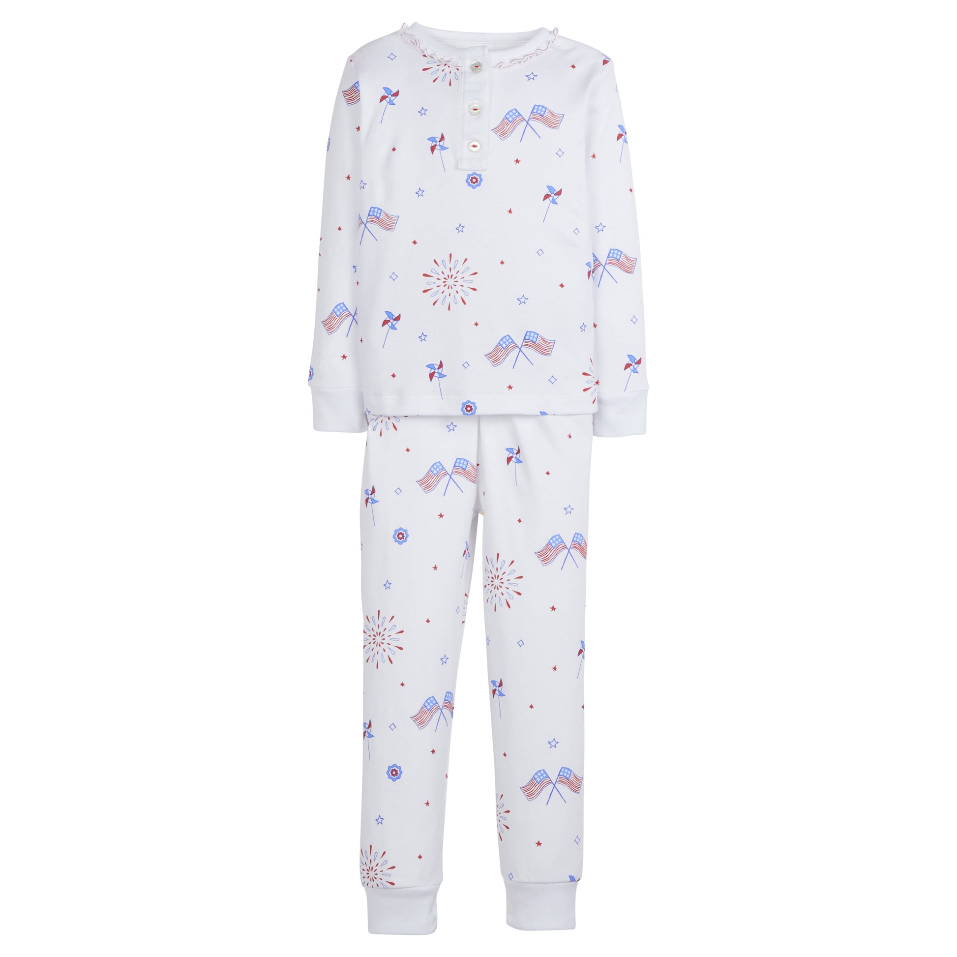 Show some star spangled spirit in our new 4th of July jammies! Made from our softest white pima cotton, this print features an adorable flag and fireworks print in soft reds and blues, just right for Summer! Your little girl will love this design, and baby sibling can coordinate in our matching Printed Playsuit - Patriotic Flags.